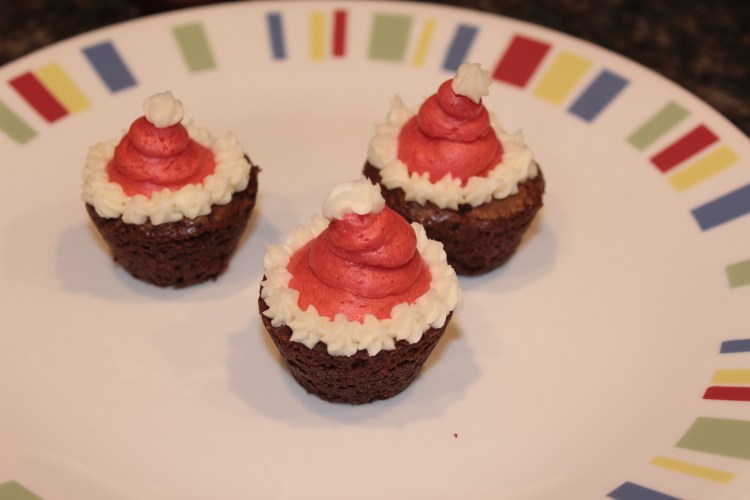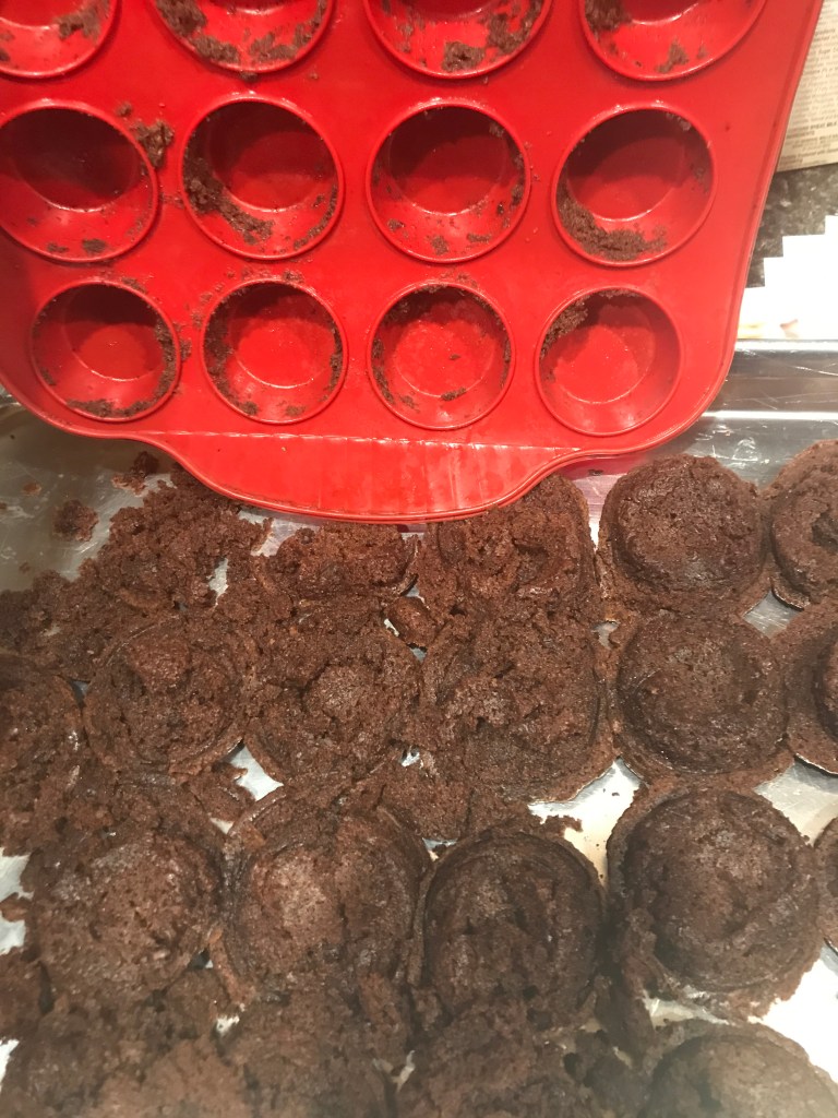 I will say I had a little bit of a failure at first!! I tried using my middle sized cookie scoop which is 1.5-2 TBSP and I made them in my silicone mini cupcake pan. That was a bad idea! They puffed up way over the top of the pan then deflated giving them crusty tops mushed together. When I pulled them out, I let them cool about 10 minutes and they were slightly warm. I tried popping them out but the tops fell off. I realized they weren’t coming out so I just flipped the WHOLE thing onto a cookie sheet and tried to get them out. The tops came off of those too. Leaving me with a mess! However, in sampling them I really liked the flavor of them. They were maybe a TAD sweet but over all good chocolatey and fudgy which is what I was going for.